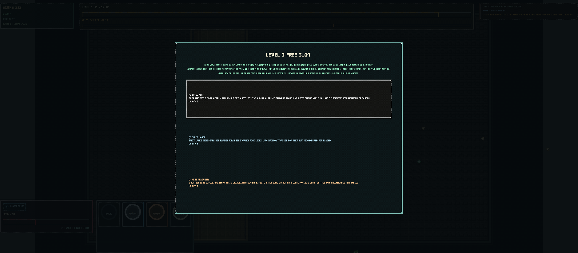 SLIME ARENA는 시작할 때 근거리와 원거리 두 타입 중 하나를 고르고, 웨이브를 버티며 레벨업할 때마다 스킬 트리를 찍는 구조다. 웨이브마다 몬스터를 다 잡으면 다음 단계로 넘어가고, 보스도 있다. 느낌으로는 2D 액션 디펜스와 뱀서라이크의 중간쯤에 있다.