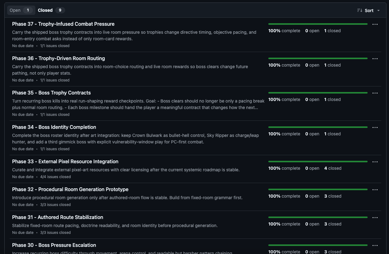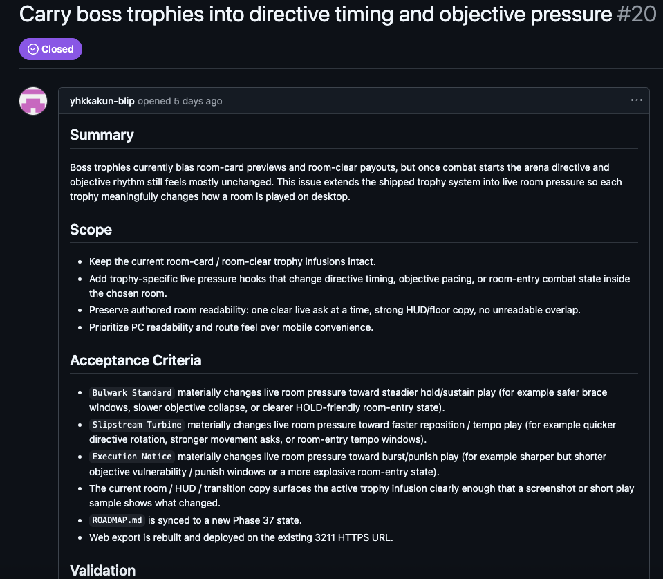 또 하나 좋았던 점은 milestone과 issue를 쓰면서 판단 단위를 강제로 작게 만들 수 있었다는 점이다. 그냥 게임 만들어라고 두는 것보다, 지금 단계에서 무엇을 검증해야 하는지가 훨씬 분명해졌다. 실제로 전투 루프, 웨이브 진행, 보스전, 레벨업 선택지, 밸런스 조정 같은 작업을 각각 따로 굴릴 수 있었다. 이건 나중에 다시 보더라도 히스토리가 남는다는 점에서 단순 채팅 로그보다 훨씬 좋았다.